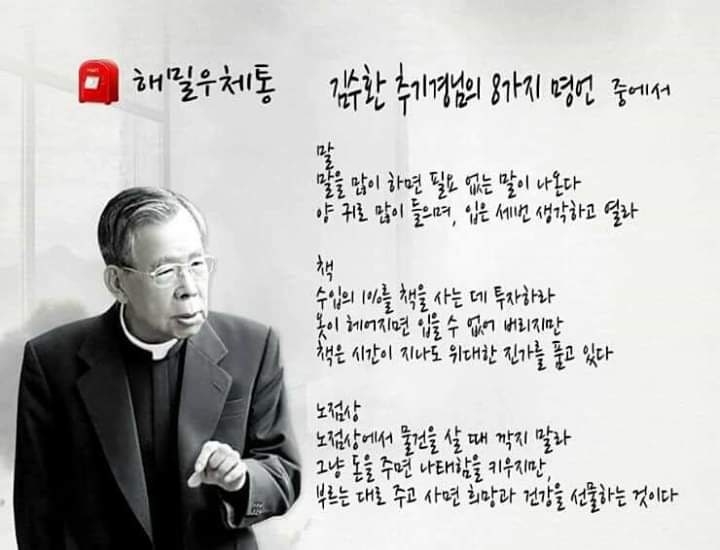 6. 분노(Anger) 화를 내는 사람은 늘 손해를 본다. 화를 내는 사람은 자신도 죽이고 남도 죽인다. 화를 내는 사람에게는 가까이 다가가는 사람이 없기 때문에 늘 외롭고 외롭습니다. 7. 기도(祈禱) 기도는 녹슬었다. 쇠를 녹여 천년 동안 흑암의 굴을 밝히는 빛의 광선이니라 주먹을 꽉 쥐는 것보다 두 손을 모으고 기도하는 사람이 더 강하다. 기도는 자기 성찰을 찾는 데 도움이 되고 인생 전체에 유익이 됩니다. 8. 이웃에게 무슨 일이 일어나는가? 이웃이 있더라도 등을 돌리지 마십시오. 이웃은 당신의 모습을 비춰주는 큰 거울과 같습니다. 이웃이 돌아서거나 마주쳐도 웃지 않는다면 목욕을 하고 바르게 앉아 자신을 돌아보세요. 9. 사랑(Love) 머리와 입으로 나누어 보세요. 사랑에는 향기가 없습니다. 진정한 사람에게는 이해, 관용, 관용, 동화, 자기 굴욕이 선행됩니다. ‘사랑이 머리에서 가슴으로 내려오는 데 70년이 걸렸다’고 하더군요. – 김수환 추기경의 인생 명언 9가지 –
