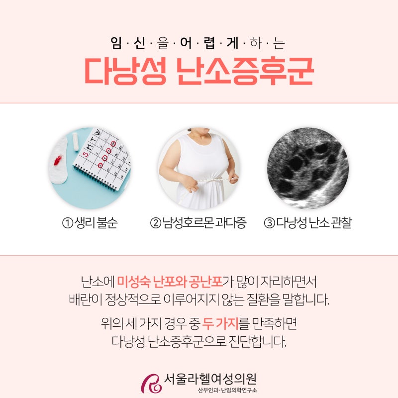 시상하부, 뇌하수체, 난소의 기능 장애를 나타내며, 호르몬 피드백 메커니즘의 이상과 비만으로 인해 발생합니다. 증상은 월경불순, 월경중단, 무배란 등이기 때문에 다낭성난소증후군이면 임신이 힘들거나 심할 경우 포기할 것이라고 생각하는 분들도 계시지만 사실은 그렇지 않습니다. 난소기능을 강화하고 스스로 배란을 도우면 성공할 수 있어요!!
