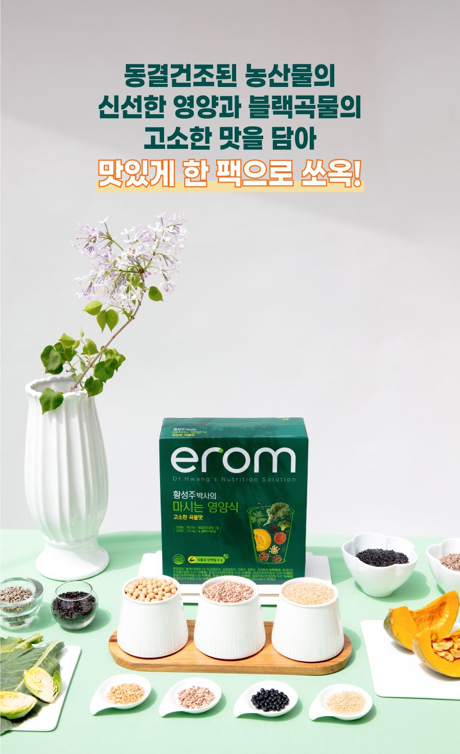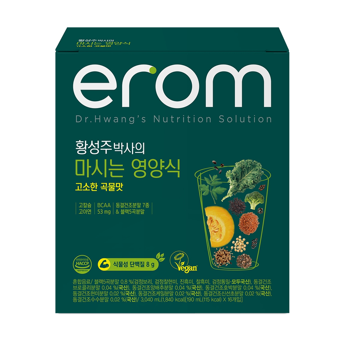 황성주 박사의 영양음료는 100% 국내산 고품질 농산물을 사용하여 안심하고 먹을 수 있는 7종의 동결건조분말과 5종의 흑곡을 배합하였습니다. 신선하고 영양가 있는 검은색의 동결 건조 농산물과 대두 단백질에는 맛있는 팩에 곡물도 포함되어 있습니다!