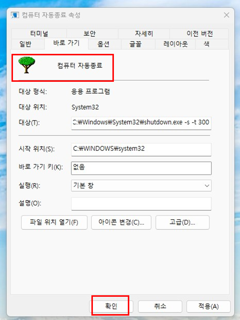 시간을 변경하려면 바로가기 탭에서 대상을 편집하면 됩니다. 아이콘 변경 버튼을 클릭해 볼까요!