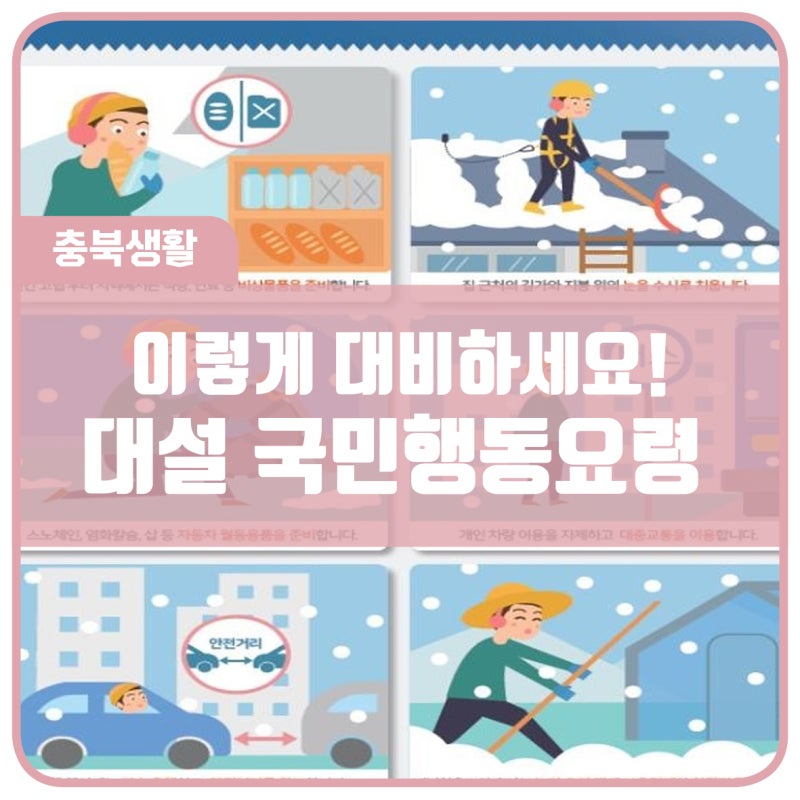 재해, 폭설 발생 시 국가 행동지침⬩ 고립이 우려되는 산간지역에서는 식량, 연료 등 비상용품을 준비합니다.⬩ 집 앞 정기적으로 눈을 치우십시오.⬩ 스노우체인, 자동차 방한용품 등을 준비합니다. 염화칼슘, 삽. ⬩ 개인 차량 통행을 줄이고 대중교통을 이용하세요. ⬩ 운전 시에는 저속으로 운전하고 안전거리를 유지하세요. ⬩ 차량이 좌초된 경우 119에 신고하고 차량 내 TV, 라디오, 인터넷을 통해 기상 상황을 확인하세요. 그리고 구조를 기다리세요.