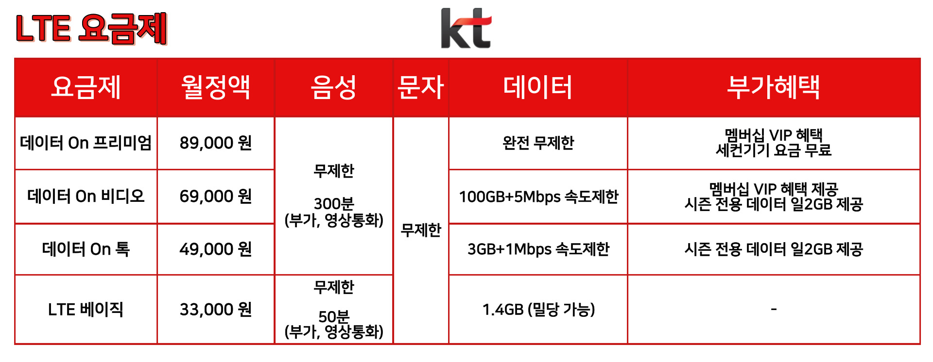 주요 장점은 다음과 같습니다. 약정 없이 자유롭게 이용 가능 다양한 기기(항공기, 중고폰 등)와 호환 편리한 비대면 처리 미납, 연체 이력 상관없이 신청 가능 추가 없음 소액결제 차단으로 인한 비용 2. KT LTE 요금제 종류 비교 합리적인 요금제에 대하여